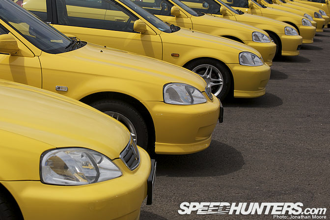 Impossible de rater ce club. Il s'agit d'une édition limitée dont j'avais complètement oublié l'existence jusqu'à ce que je voie une trentaine de Civic jaune canari alignées. Ils ont été marqués par l'équipe Jordan de Formule 1 dans le cadre de leur accord de moteur avec Honda, et 500 exemplaires ont été fabriqués en 1999. Des kits de carrosserie de style Type-R assortis à un intérieur jaune et noir assorti aux livrées des voitures de F1, avec des logos Buzzin Hornets sur les sièges et un moteur VTEC amélioré de 160 ch.