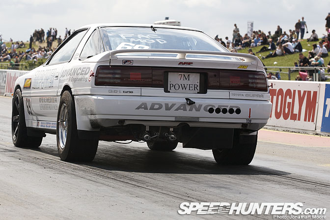 Ai-je dit que j'aime les Supras ?… Montée sur de gros pneus dragster, sous cet angle, la forme en coin du Mark III de Keith Carr a une posture particulièrement agressive.