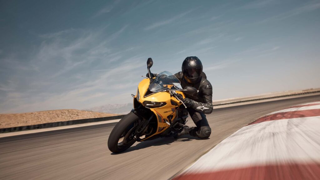 La Daytona a parfois perdu en popularité face à ses concurrentes, malgré un moteur vif et environ 12 à 20 ch de plus, car elle n’était pas à la hauteur lorsque les choses tournaient mal. Désormais, la Daytona est équipée d’une nouvelle fourche Showa à gros pistons USD de 41 mm à fonction séparée, réglable en compression et en rebond, qui est relativement comparable à la R7 de Yamaha, souvent présentée comme la meilleure de sa catégorie en matière de maniabilité racée.